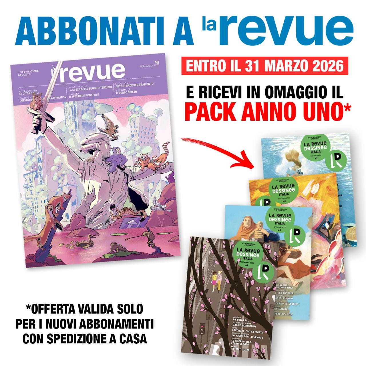 Sapete perché la Revue funziona da 5 anni e sempre meglio e abbiamo sempre più abbonati? Perché vendiamo a chi non legge fumetti. Fa riflettere no? E anche perché ci stiamo allontanando sempre di più dalle logiche editoriali tour court. Per scoprirci o stenerci, da ieri: nuova offerta che scade il 31 marzo, sbrigatevi per l’amor di dio, che vi regaliamo tutto il pack anno uno.